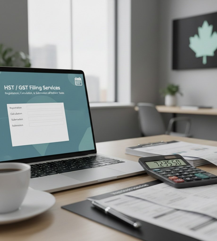 Registration, calculation, and filing of indirect taxes, including HST and GST.